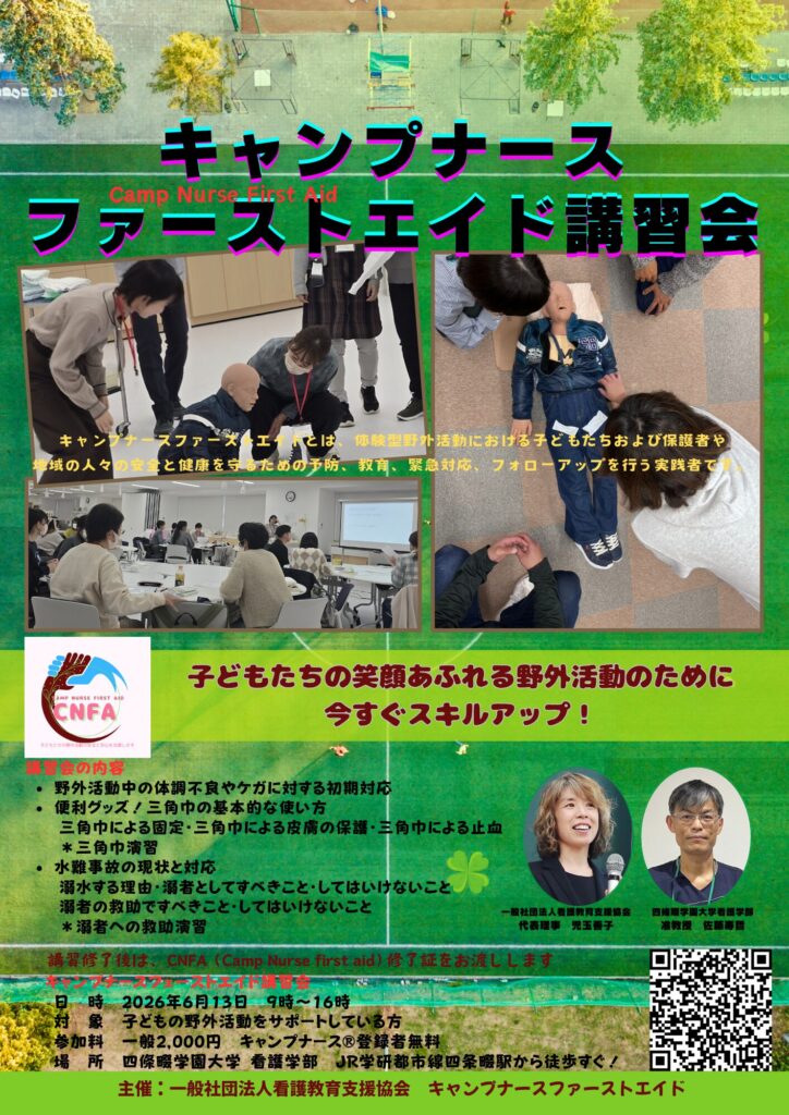 一般社団法人看護教育支援協会では、「キャンプナースファーストエイド講習会」を開催いたします。
