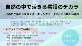 自然の中で活きる看護のチカラ いのちと暮らしを支える、キャンプナース®という新しい選択 自然の中で、命を守り、暮らしを応援する看護師。キャンプナース®は、新しい看護のかたちです。 この講座では、自然の中で子どもたちや子ど … 続きを読む 大阪公立大学 × 看護教育支援協会 合同企画