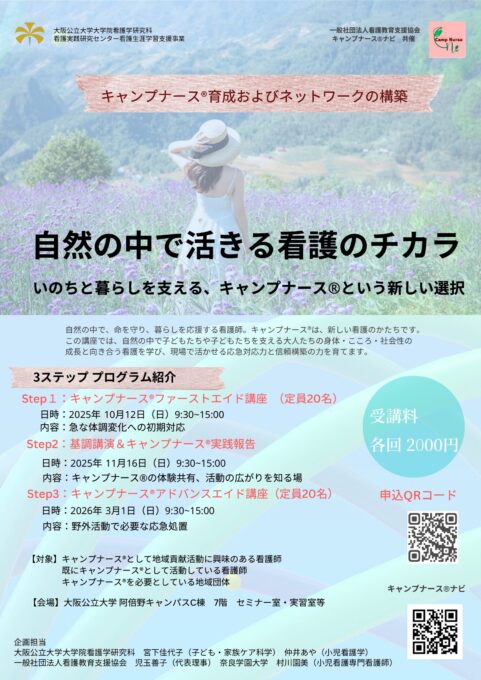 詳細・申込は「大阪公立大学・看護実践研究センター」看護生涯学習支援・キャンプナース®の育成およびネットワークの構築」まで